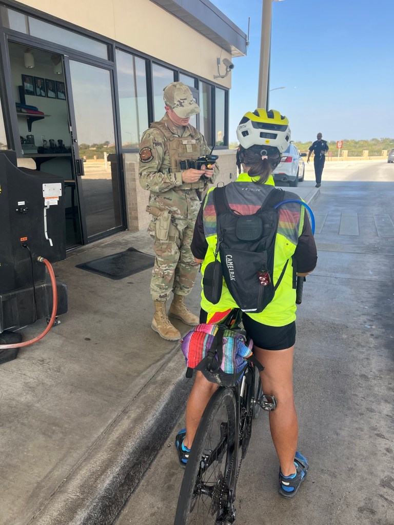 We had to coordinate our ride and time to go onto the base. Most of us rode to Del Rio around noon. The Air Force base was another 10 miles but we agreed to meet at the visitor center at 3:00 to check in. I was riding with Brent and Chris when we arrived in Del Rio. We decided to stop at Starbucks (haven’t seen one of those in a while!), and relax on their outside patio with a coffee and a light lunch. After that, we rode to the bike shop where Dana, Felix, Mark and Brent were all trying to get some bike service. Unfortunately, the service was slow and they all had to wait a long time and weren’t all pleased with the result. They are hoping the fixes will get them to Austin where there should be some better bike shops.