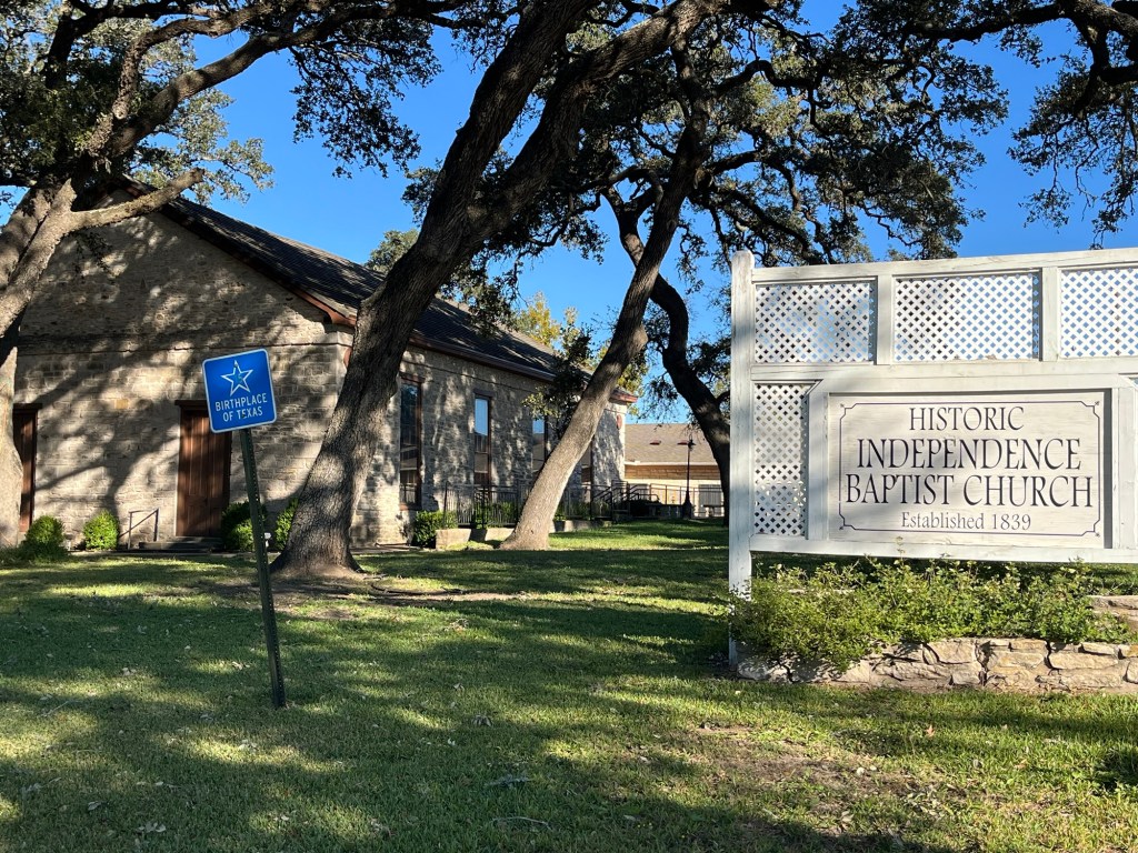 The Independence Baptist Church and sign that reads Birthplace of Texas.