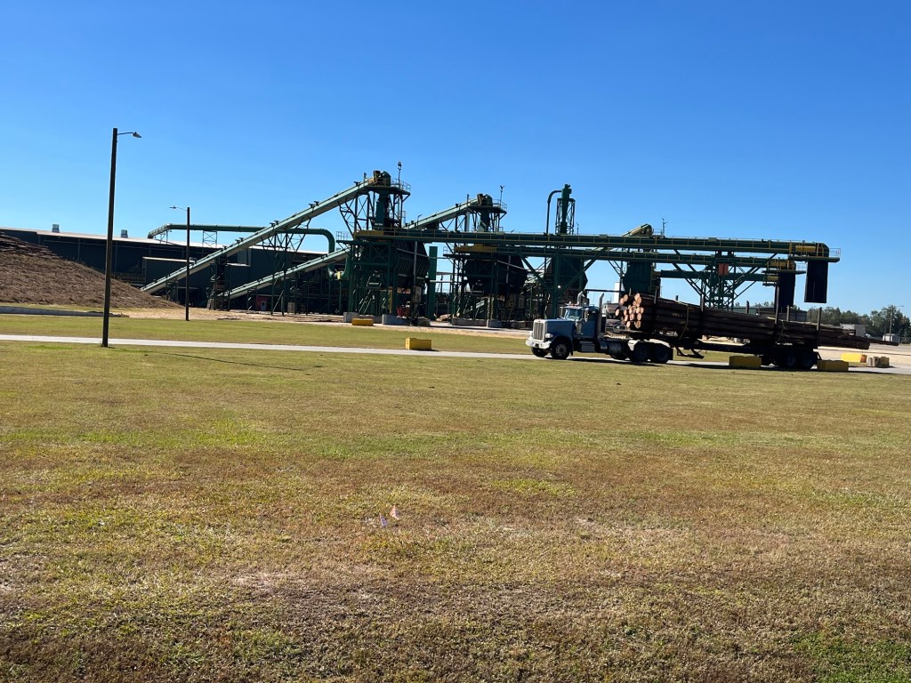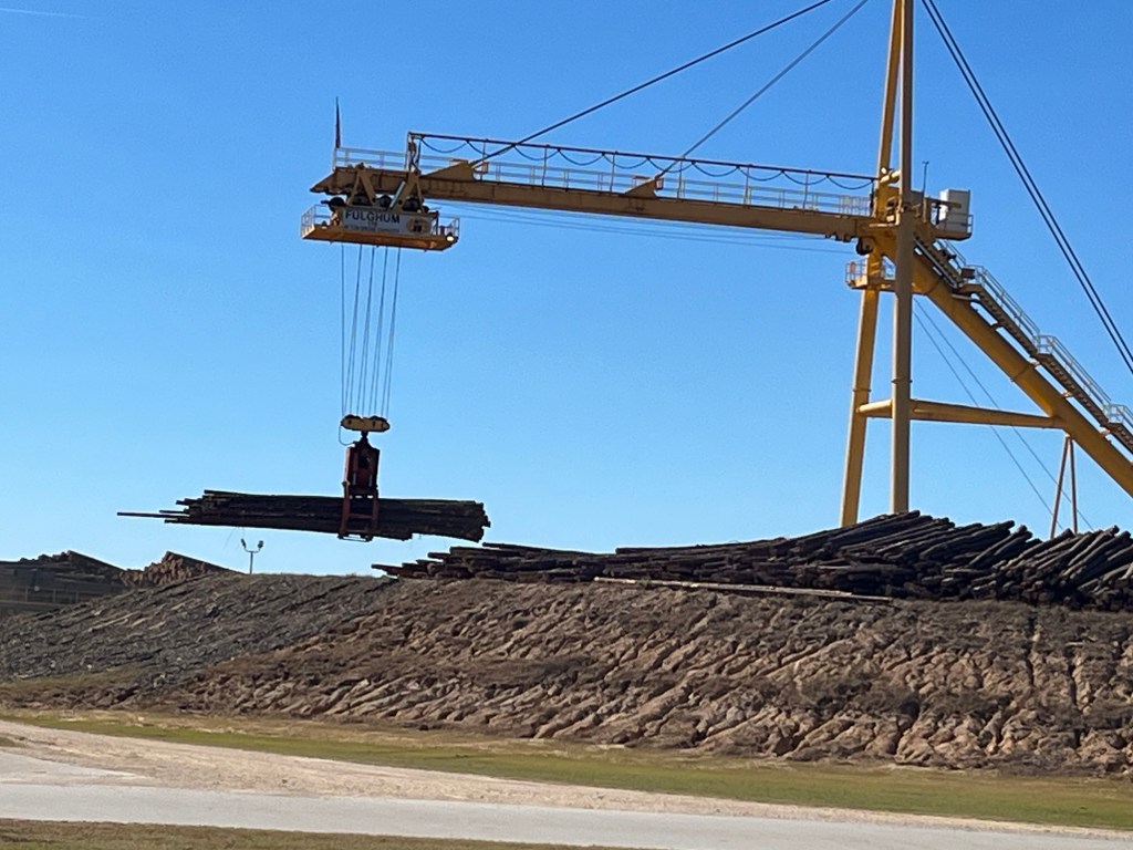 Several miles outside Merryville we came to a modern lumber mill. Nothing goes to waste anymore. The logs are cut into 2×4’s and other lumber sizes. The bark is used for mulch, the other parts are chipped to be used to make particleboard or paper, and the sawdust is collected to make wood pellets for fuel or for grilling (like my son Doug uses for his Traeger).