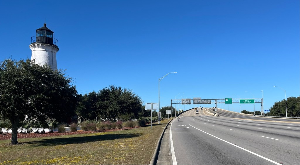 Looking back up the Pascagoula River bridge with Lighthouse Park on the left.